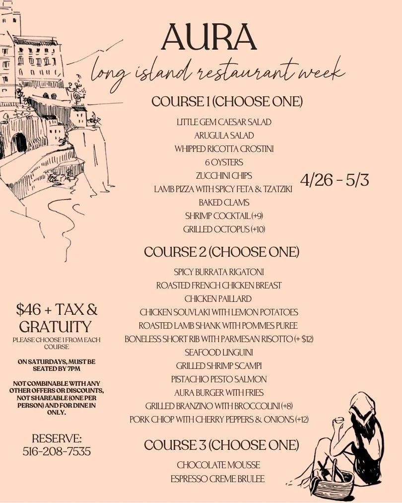 Elevate your Wednesday nights at Aura Coastal Mediterranean in Long Island with Mezze & Music—an evening of live music, shareable Mediterranean plates, and coastal vibes. Enjoy $1 East Coast oysters all night, $15 share plates like souvlaki, lamb kabobs, and mezze dips, plus $22 Mediterranean boards made for sharing. Pair it all with $12 wines by the glass and unwind to live music every Wednesday in our warm, seaside setting.