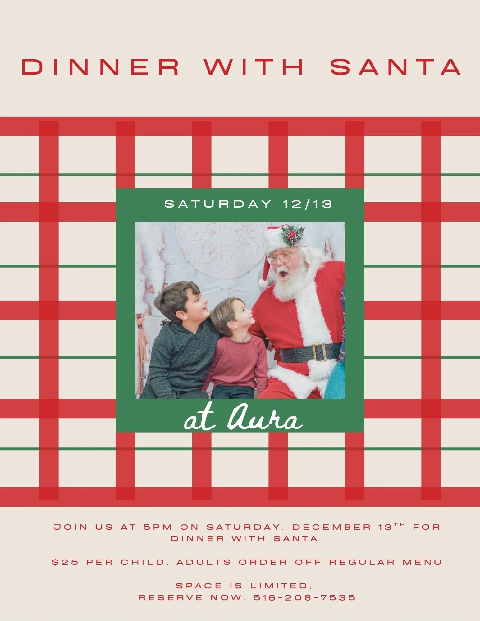 Santa’s making a special stop at Aura! 🎅✨ Join us on Saturday, December 13th at 5pm for a festive family dinner filled with holiday magic, photos, and plenty of cheer.