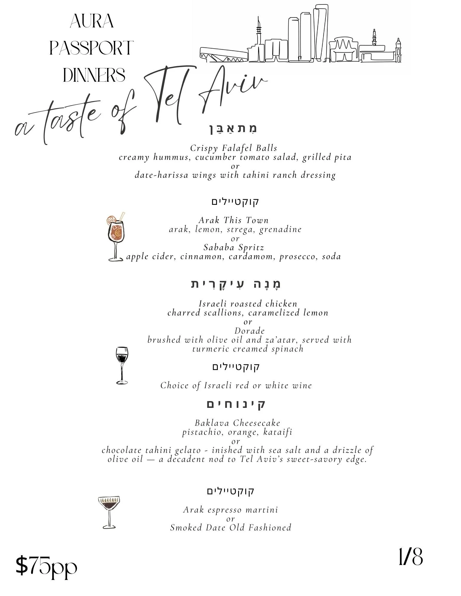 Passport Dinner: A Taste of Tel Aviv Thursday, January 8, 2026 5:00 PM 10:00 PM Aura 4338 Austin Boulevard Island Park, NY, 11558 United States (map) Google Calendar ICS
